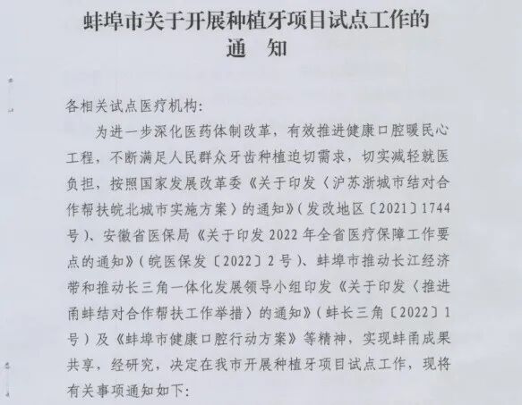 近期,安徽省蚌埠市医保局发布公告称,为进一步深化医药体制改革,有效推进健康口腔暖民心工程,不断满足人民群众牙齿种植迫切需求,安徽省蚌埠市借鉴宁波的先进经验,将种植牙纳入集中采购,并引导医疗机构自8月1日起开展种植牙项目试点工作,切实减轻人民群众就医负担。